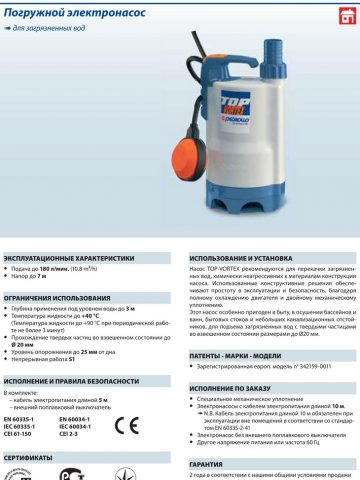Дренажные насосы TOP-VORTEX рекомендуются для перекачки загрязненных вод. Эти насосы очень просты в эксплуатации и безопасны, благодаря полному охлаждению двигателя и двойному механическому уплотнению.