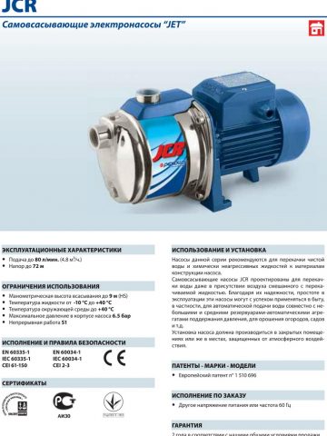 Самовсасывающие насосы JCR проектированы для перекачки воды даже в присутствии воздуха смешанного с перекачиваемой жидкостью. Благодаря их надежности, простоте в эксплуатации эти насосы могут с успехом применяться в быту, в частности, для автоматической подачи воды совместно с небольшими и средними резервуарами-автоматическими агрегатами поддержания давления, для орошения огородов, садов и т.д.