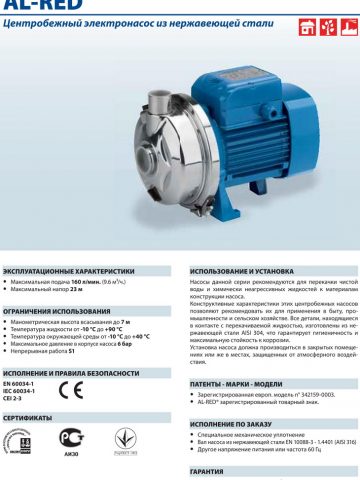 Конструктивные характеристики этих центробежных насосов позволяют рекомендовать их для применения в быту, промышленности и сельском хозяйстве. Все детали, находящиеся в контакте с перекачиваемой жидкостью, изготовлены из нержавеющей стали AISI 304, что гарантирует гигиеничность и максимальную стойкость к коррозии.