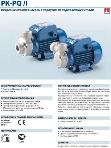 Они рекомендуются для перекачки чистой воды без абразивных частиц и химически незгрессивных жидкостей к материалам, из которых сделан насос.