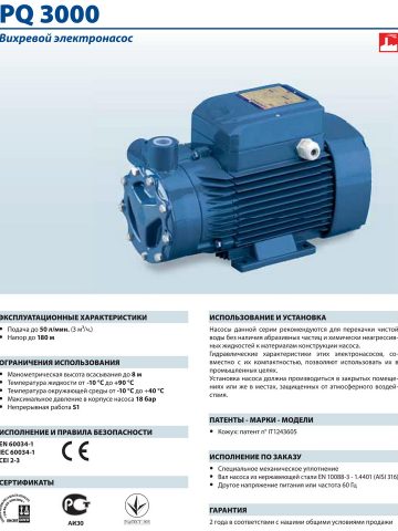 Насосы данной серии рекомендуются для перекачки чистой воды без абразивных частиц и химически неагрессивных жидкостей к материалам, из которых сделан насос.