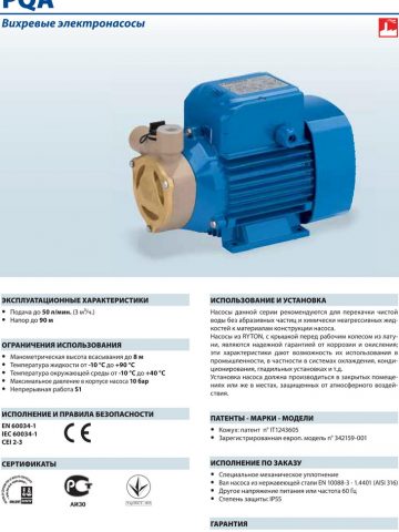 Насосы данной серии рекомендуются для перекачки чистой воды без абразивных частиц и химически неагрессивных жидкостей к материалам, из которых сделан насос.