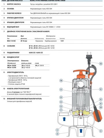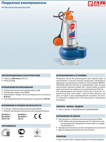 Погружные насосы МС рекомендуются для подъема воды со значительной и сильной степенью загрязнения, применимы в домашнем и коммунальном хозяйстве. Они оснащены ДВУХКАНАЛЬНЫМ рабочим колесом из нержавеющей стали, которое обеспечивает перекачку жидкостей с присутствием во взвеси коротковолокнистых твердых частиц диаметром до Ø 50 мм.