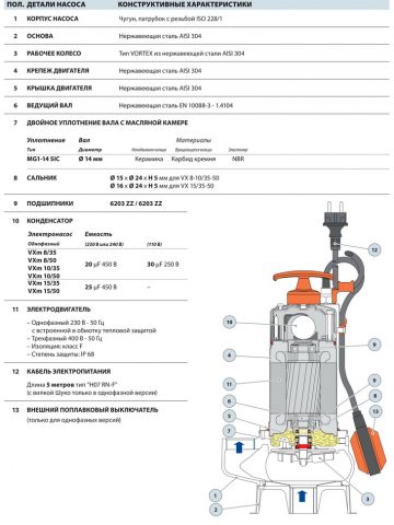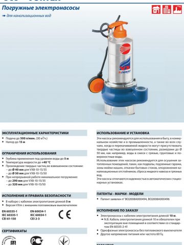Эти насосы рекомендуются для использования в быту, в коммунальном хозяйстве и в промышленности, а также во всех случаях, когда в перекачиваемой жидкости могут присутствовать твердые частицы во взвешенном состоянии, размерами до Ø 50 мм, как например, воды в смеси с грязью, грунтовые и поверхностные воды.