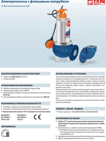 Эти насосы рекомендуются для использования в быту, в коммунальном хозяйстве и в промышленности, а также во всех случаях, когда в перекачиваемой жидкости могут присутствовать твердые частицы во вавешенном состоянии, размерами до Ø 50 мм, как например, воды в смеси с грязью, грунтовые и поверхностные воды.
